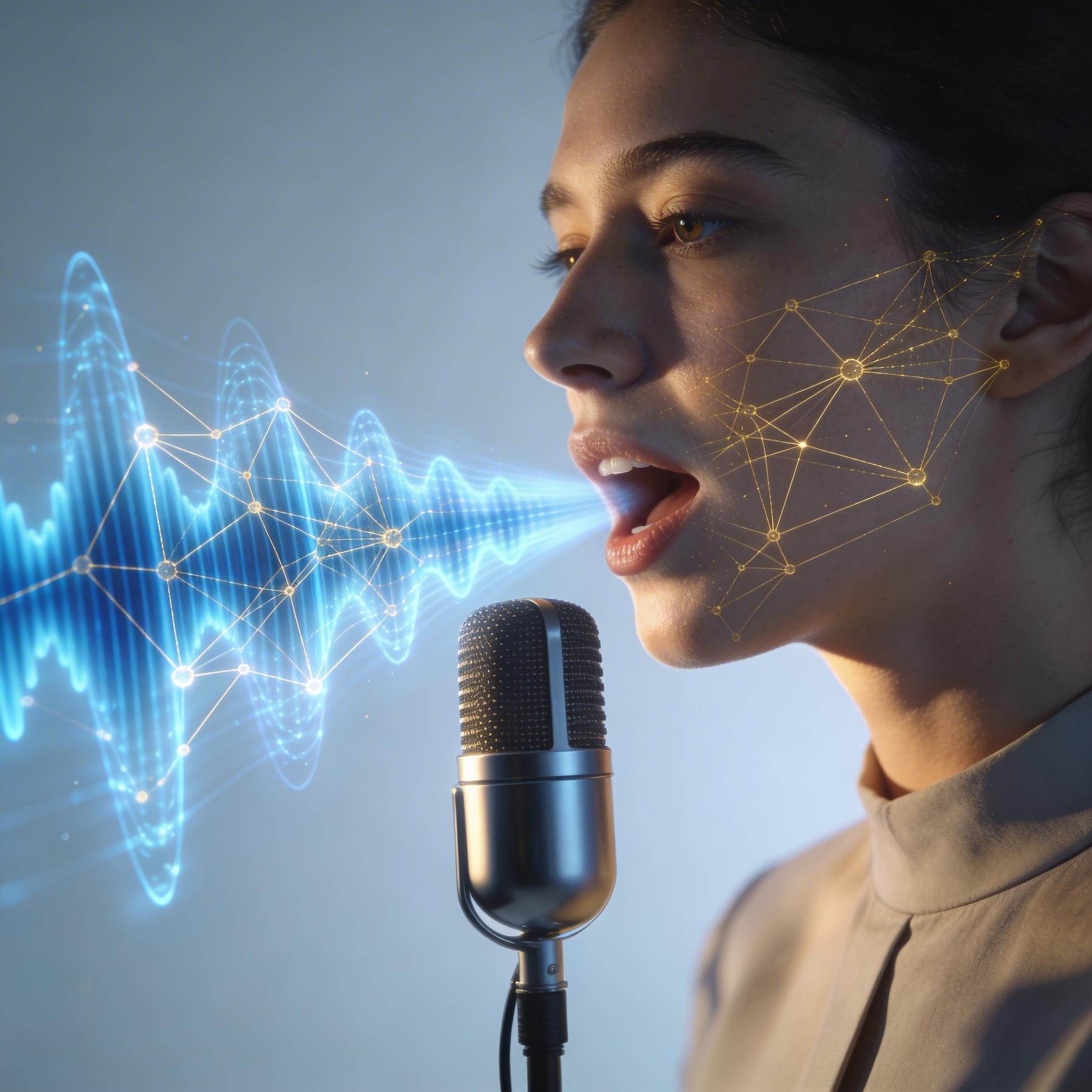AI analyzes acoustic patterns for early detection using soundwave data, represented by glowing neon shapes and data blocks.